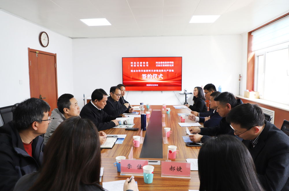 为深入学习贯彻习近平总书记重要指示精神和党中央决策部署,精准对接农业企业科技需求,全力服务全省农业农村现代化,持续提升科技成果转化效能,2026年3月24日下午,我院与河北天府农业科技有限公司合作签约仪式在我所成功举行。河北省农林科学院、河北天府农业科技有限公司、河北省农民合作社行业协会等单位领导和负责同志参加。