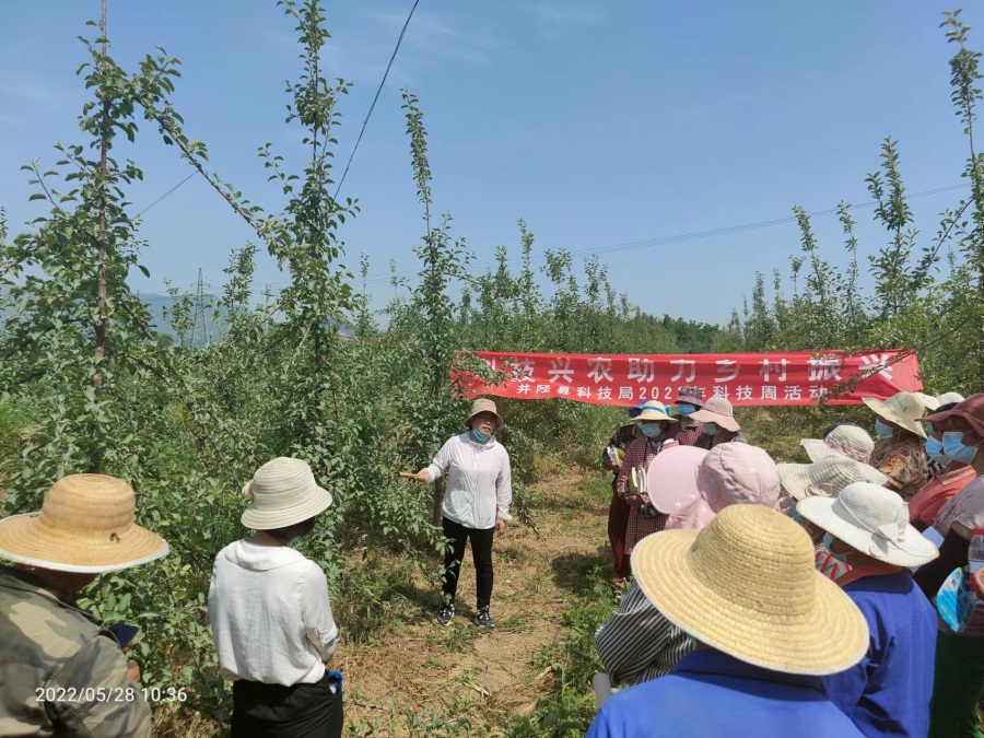 2022年5月28日,苹果栽培团队石海强研究员、杨素苗副研究员到井陉县孙庄乡利源果树种植专业合作社,与井陉县科技局共同举办了苹果套袋前后管理技术培训。