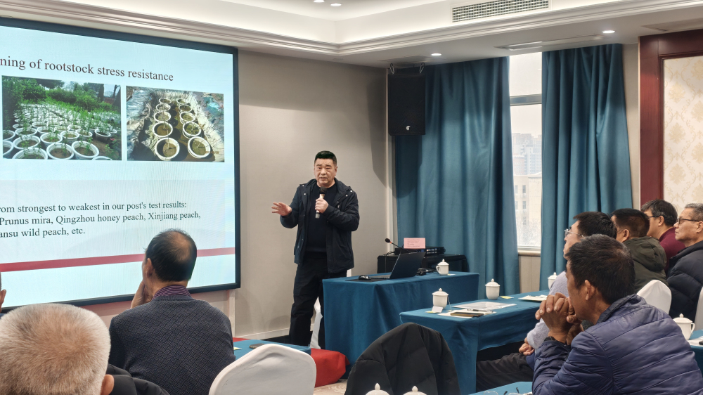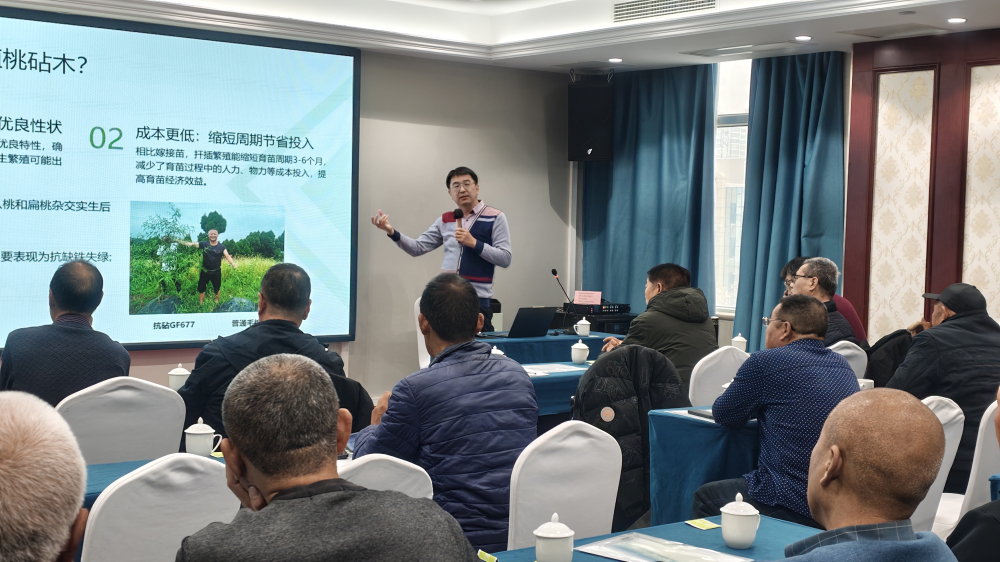 会上,各示范县负责人就今年的工作进展情况及产区出现的新问题进行了汇报。任飞研究员和姜林研究员就产区出现的问题以“桃砧木扦插技术实操培训”和“核果类砧木特性及其苗木生产技术”为题进行了技术讲座,并现场解答了果农提出的疑问。