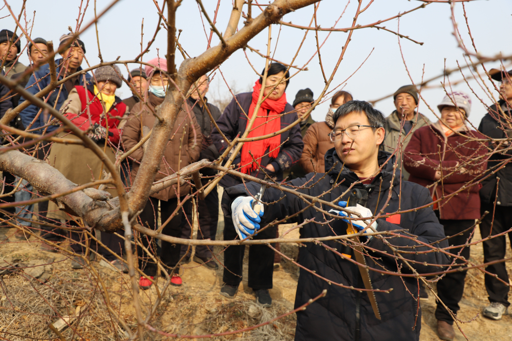 在千根村,两位专家先从樱桃、桃生长结果习性出发,详细介绍了适宜的丰产优质树体结构及冬季修剪技术关键,随后,赴果园进行现场修剪示范,马文会研究员示范了过密樱桃园的树体改造技术,王越辉研究员则向果农传授了桃树冬剪的“一看、二选、三剪、一回头”技术,得到了果农高度认可和热烈掌声。最后,两位专家认真解答了果农们提出的各种生产问题。